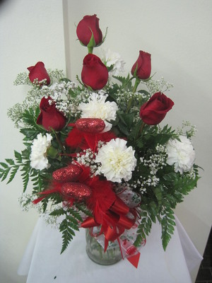 Six red roses and six white carnations make a classic Valentine bouquet. Perfect for your sweetheart!